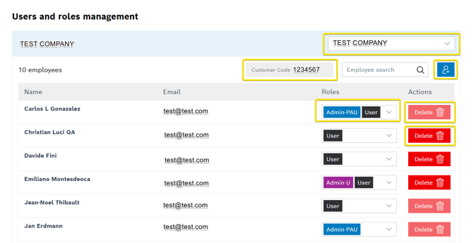 On the main User Management page, you will see a list of your company’s users. Depending on your assigned role, you can edit users with roles below your own (see the Role Guide for details). You can also view subsidiary companies using the dropdown menu, check your active customer code for the selected brand, and create or delete users.