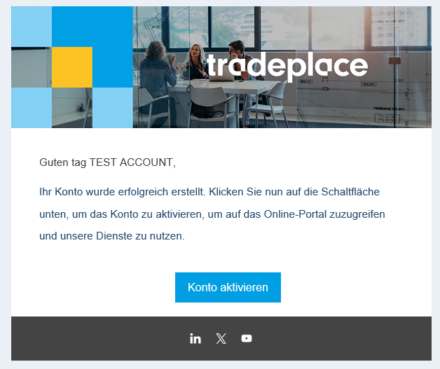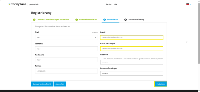 Wenn Ihre primäre E-Mail jane.doe@beispiel.com ist, können Sie jane.doe+land_1@beispiel.com für die Registrierung am Tradeplace Portals hub verwenden. Diese Funktion ist besonders nützlich für Benutzer, die mehrere Konten verwalten oder eingehende E-Mails effektiver filtern möchten.