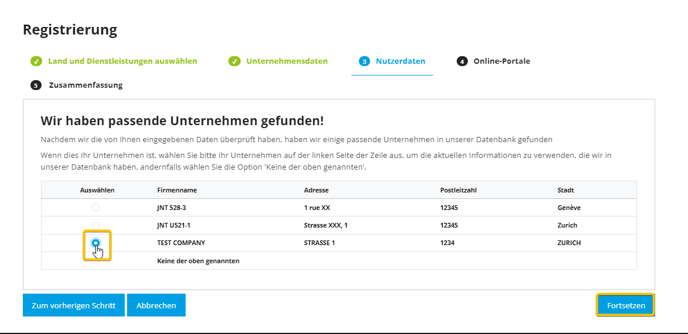 Falls Ihr Unternehmen bereits ein Konto hat, wird der Registrierungsprozess Ähnlichkeiten erkennen und den neuen Benutzer mit dem bestehenden Unternehmen zusammenführen, wenn Sie dies wählen.