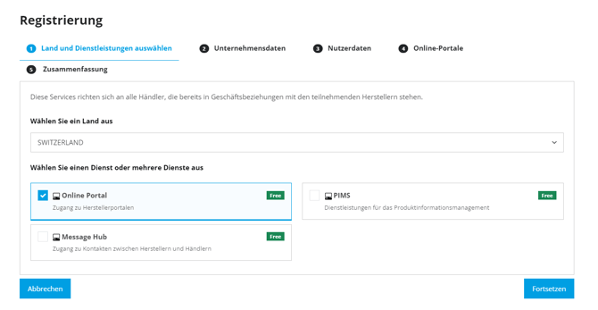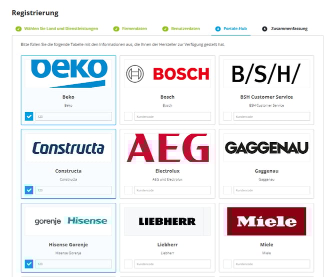Nach diesem Schritt sehen Sie die verfügbare Herstellerauswahl. Wählen Sie die gewünschten Marken aus und geben Sie Ihren Kundencode ein.