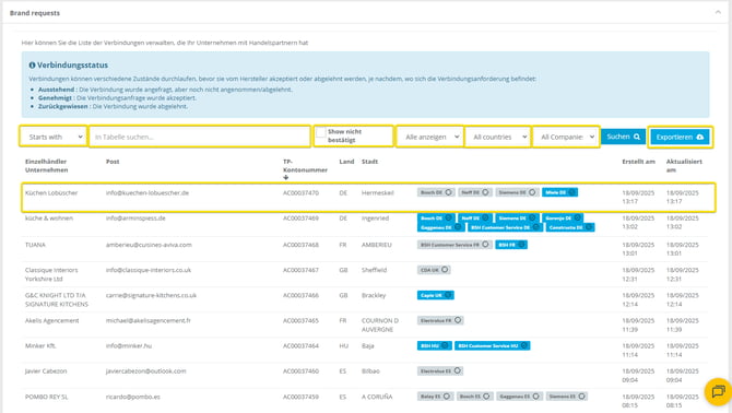 Sie können Ihre Suche nach Firmenname, E-Mail-Adresse, Land und Firma (wenn Sie verschiedene Marken verwalten) filtern und die „nicht bestätigten“ Konten anzeigen, indem Sie auf Show nicht bestätig klicken.