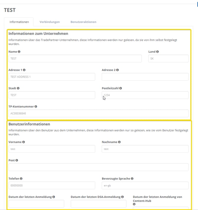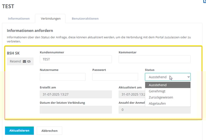 Klicken Sie auf die Registerkarte "Verbindungen" in diesem Pop-up-Fenster, wo Sie den Status der Anfrage ändern und den entsprechenden Kundencode und die Anmeldedaten hinzufügen können.