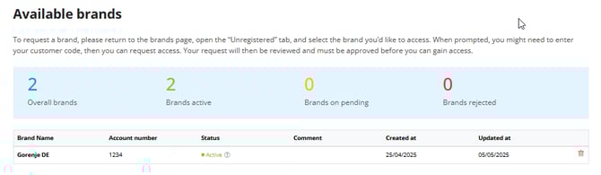 You can check all the current accepted or pending brands and see the customer code used when entering the brand management space.