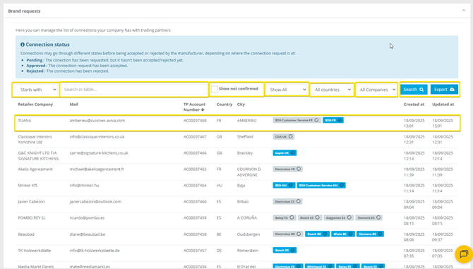 You can filter your search by company name, e-mail, country and company (if you manage different brands) as well as displaying the "not confirmed" accounts by clicking on Show not confirmed
