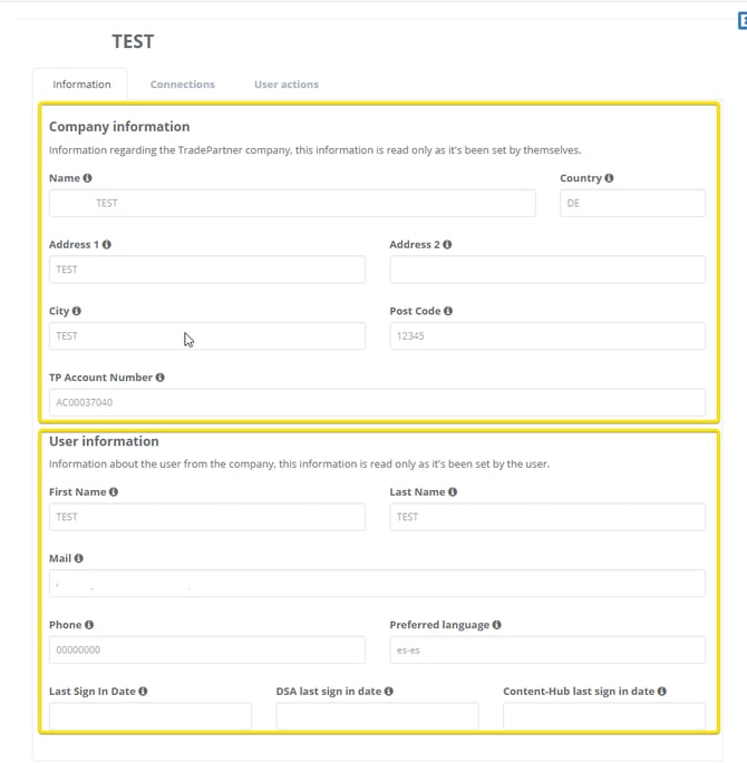 When clicking on a company a pop-up window will appear on the right of the page displaying the company and user information first.