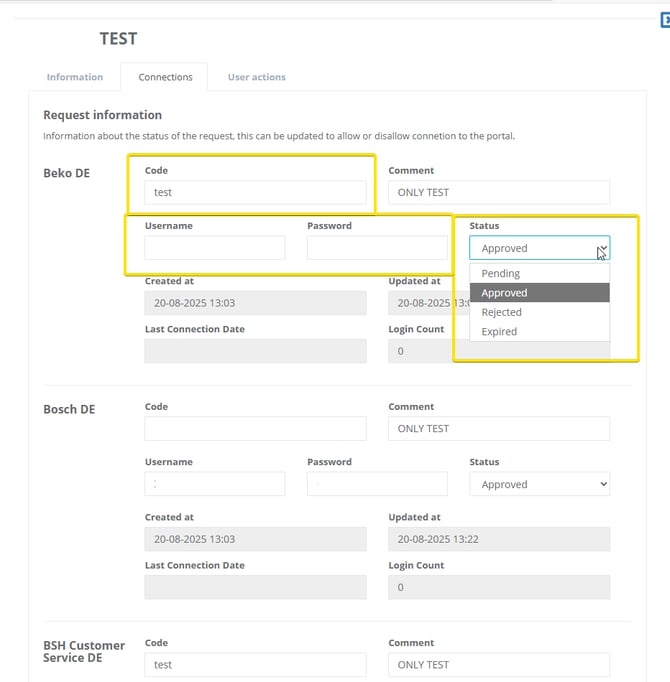 Click on the Connections tab inside this pop up, where you'll be able to manage the request by changing it's status as well as adding the correspondent customer code and credentials.