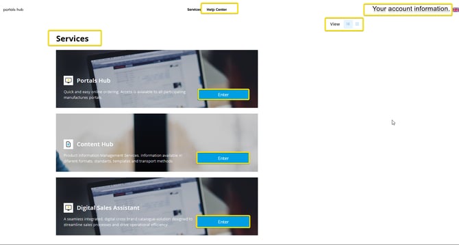 Once your account is active, you will be able to log in and see the available services, your account configuration, the language preference, access to our help center and a button to change the page view.