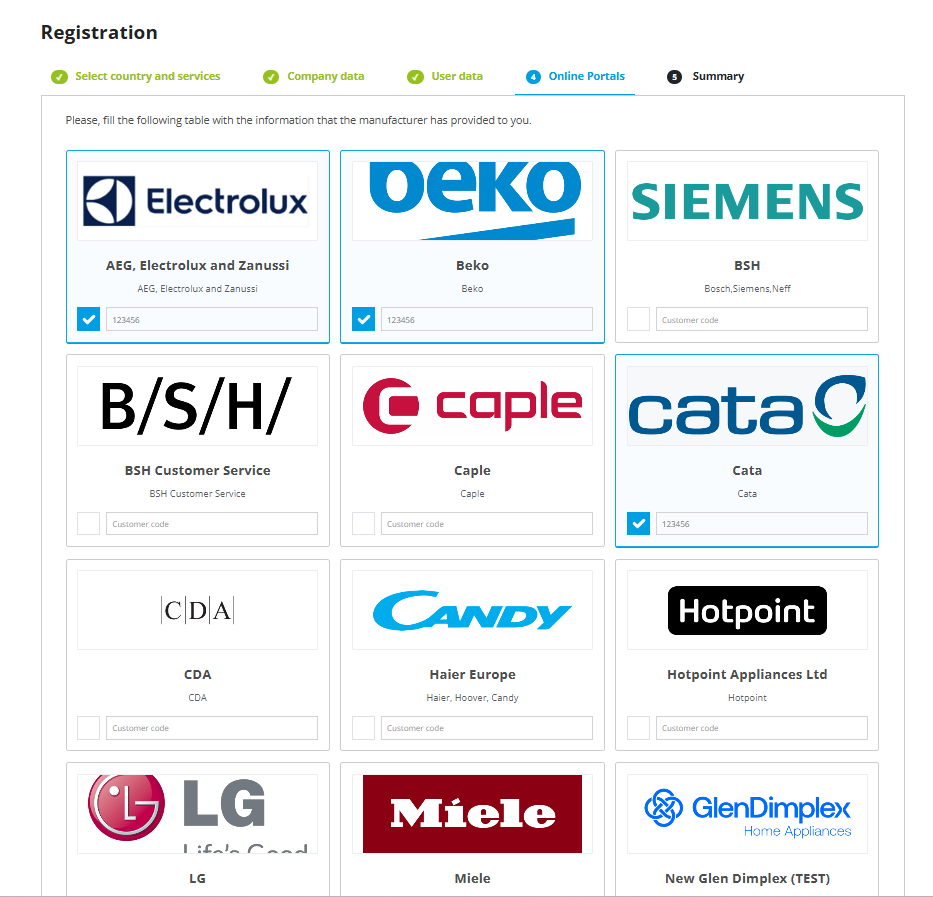After this step you will see the available Manufacturer selection, select the desired brands and add your customer code.