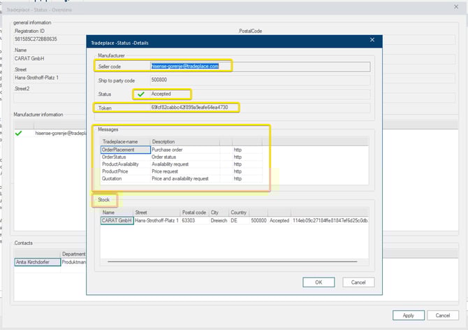 Once you are inside the individual status requests for each manufacturer, you will see their seller code, the ship-to party code that is currently configured, the status overview, and the requested messages.
