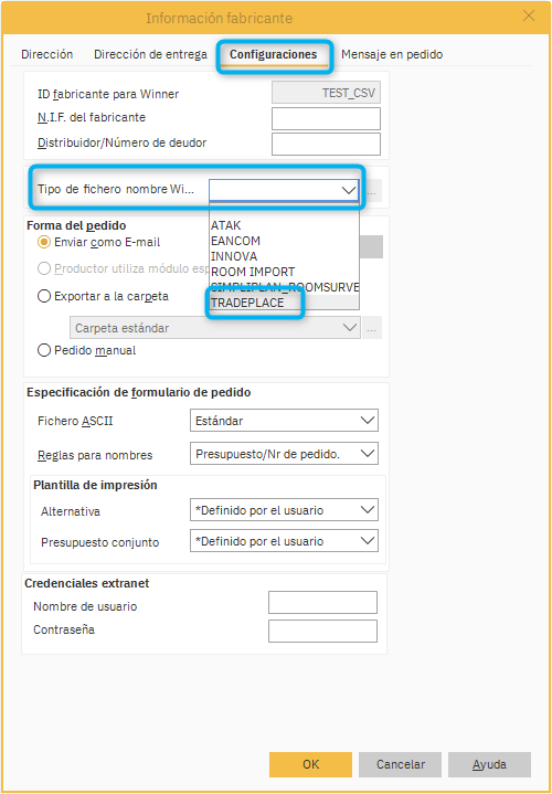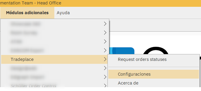 En la barra de menú de Winner, acceda a la configuración del módulo Tradeplace seleccionando Módulos adicionales Tradeplace Configuración.