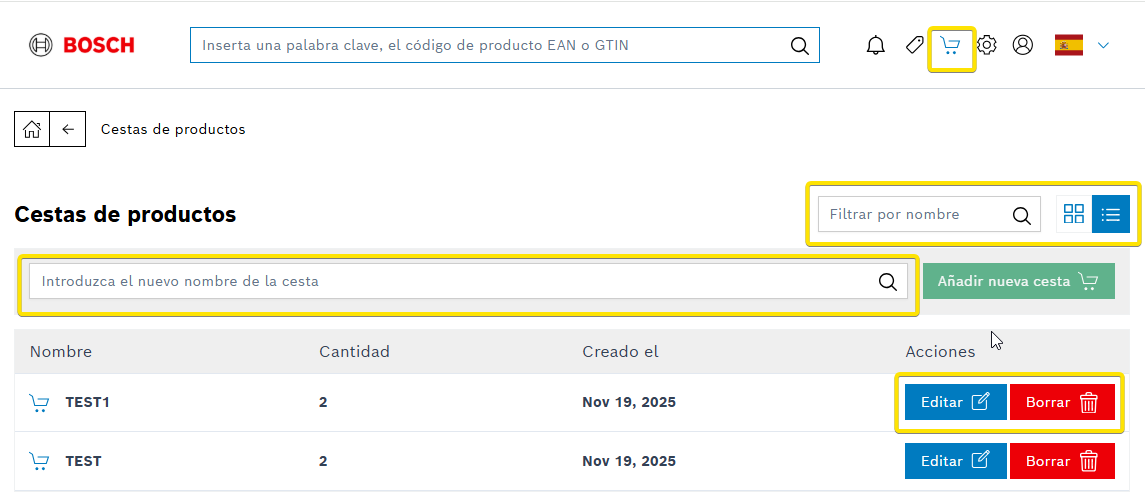 En esta página, puede ver todas las cestas que ha creado recientemente, con opciones para editarlas o eliminarlas según sea necesario.