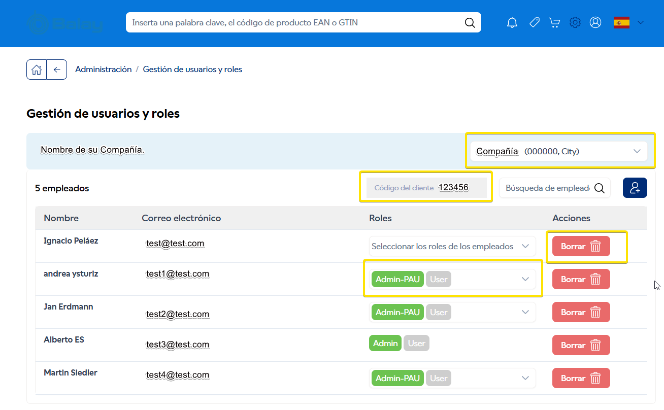 En este menú también puede consultar sus empresas subsidiarias en el menú desplegable, ver su código de cliente activo con la marca seleccionada, así como crear y eliminar usuarios.