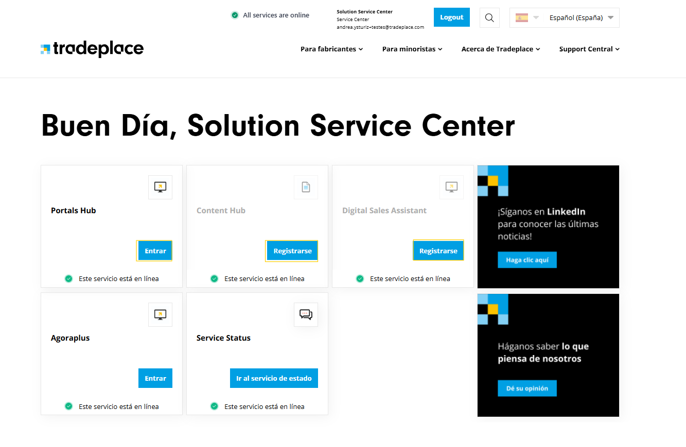 Una vez que su cuenta esté activa, podrá iniciar sesión y ver los servicios disponibles, la configuración de su cuenta, la preferencia de idioma, el acceso a nuestro centro de ayuda y un botón para cambiar la vista de la página.