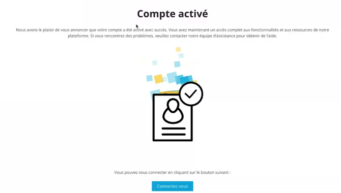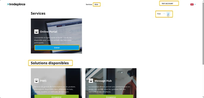 Une fois que votre compte est actif, vous pouvez vous connecter et voir les services disponibles, la configuration de votre compte, le choix de la langue, l'accès à notre centre d'aide et un bouton pour modifier l'affichage de la page.