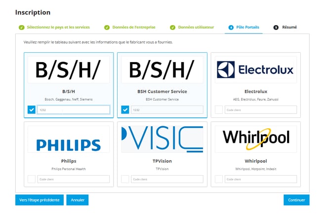 Après cette étape, vous verrez apparaître la sélection des fabricants disponibles. Sélectionnez les marques souhaitées et ajoutez votre code client.