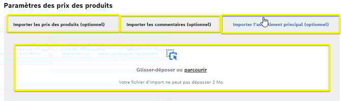 Vous pouvez également importer des fichiers avec les prix des produits, les commentaires ou l'assortiment de base, chacune de ces options ayant une limite fixée pour l'importation