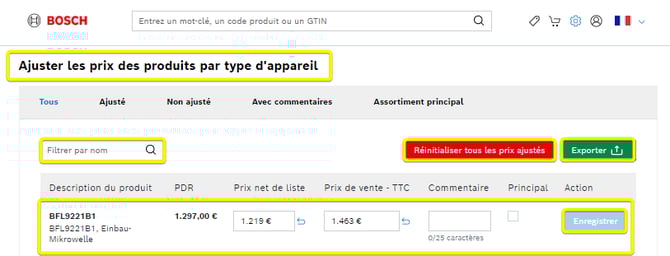 Vous pouvez également filtrer les appareils en fonction des modifications que vous avez apportées. Ces modifications peuvent être réinitialisées et exportées.