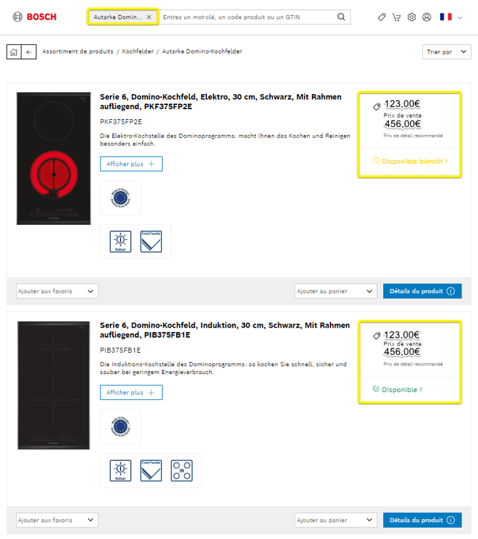 Le prix du produit s'affiche comme dans l'image suivante. Prix de vente et prix de vente conseillé.